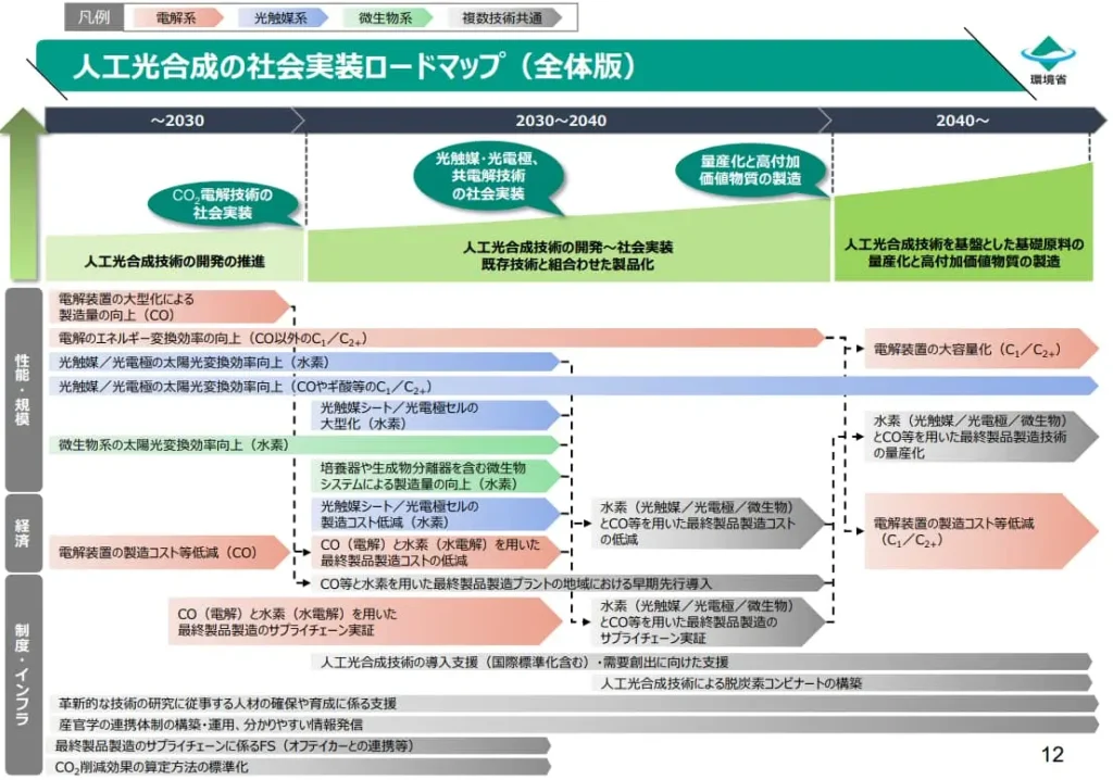 このような進展により、2040年には人工光合成が再生可能エネルギーと並ぶ「基幹的炭素処理技術」として位置づけられることが予測されます。