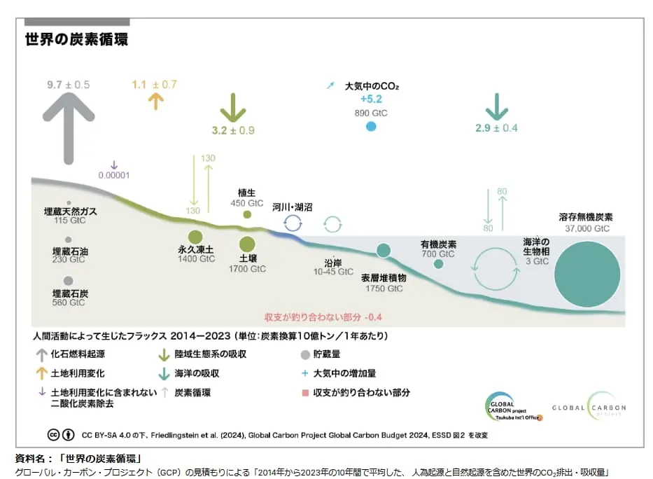 こうした人為的な排出は、すでに自然由来の排出量を上回り、地球全体の炭素バランスを崩しています。