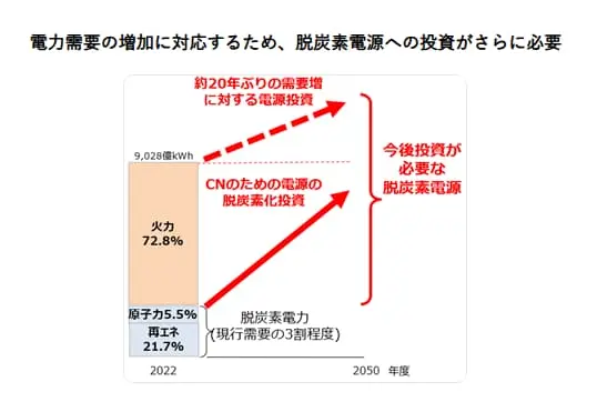 加えて、日本は2050年カーボンニュートラルを目指しており、2030年には再エネ36~38%、原子力20~22%、火力41%、水素・アンモニア1%という目標を掲げています。ところが、直近2022年度の実績は火力72.8%、再エネ21.7%、原子力5.5%であり、目標とのギャップは依然として大きいのが現状です。