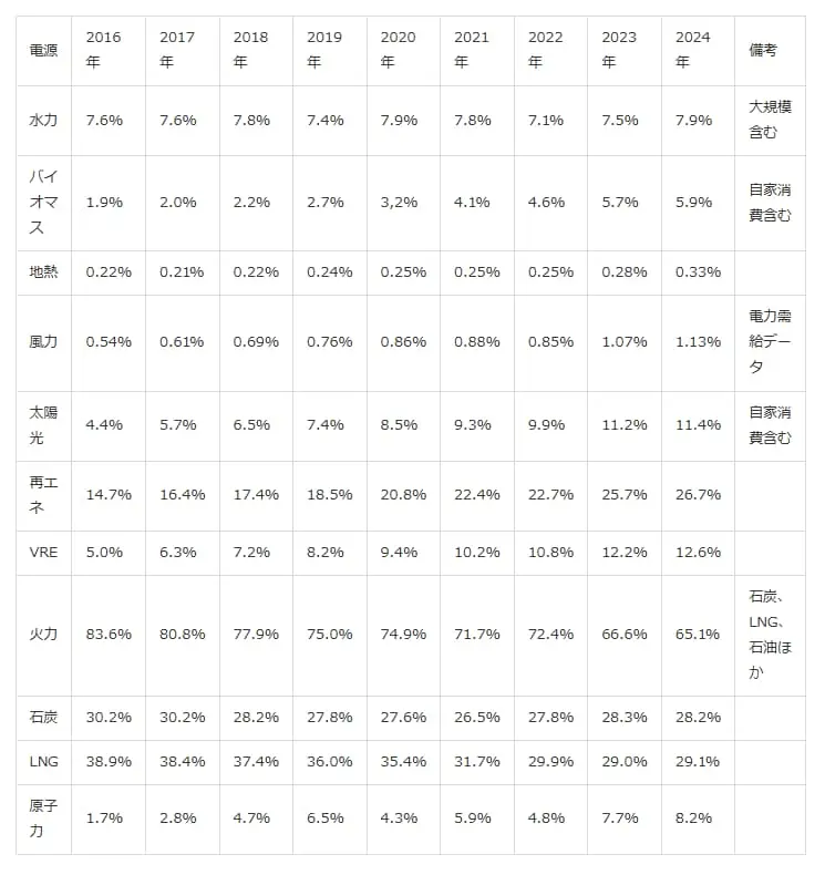 そのため、日本は依然として火力発電や原子力発電を一定割合維持しています。