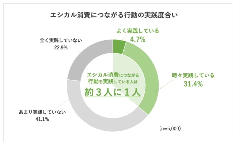 これらのアンケート結果から、エシカル消費について詳しく知っている方は多くないものの、地産地消や省エネ、ファッションや低価格といったニーズにより、結果的にエシカル消費を行っている方が一定数いる、という見方もできると思います。