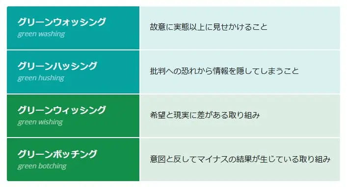 本来の環境配慮とは関係のない情報を強調したり、都合の良い一部分だけを切り取ってPRしたりすることで、消費者や投資家に誤った印象を与えてしまう点が特徴です。