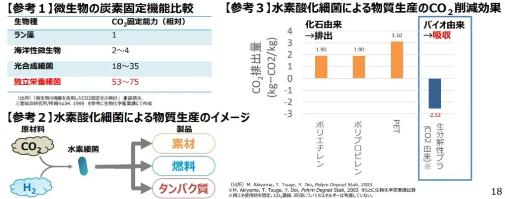 水素酸化細菌は、水素を酸化して得られるエネルギーを用い、大気中や産業施設から回収されたCO₂を有機物に変換する能力を持っています。
