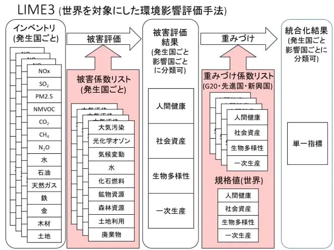 日本の研究者が開発したLIME3は、国内で広く利用される代表的なLCA影響評価手法です。