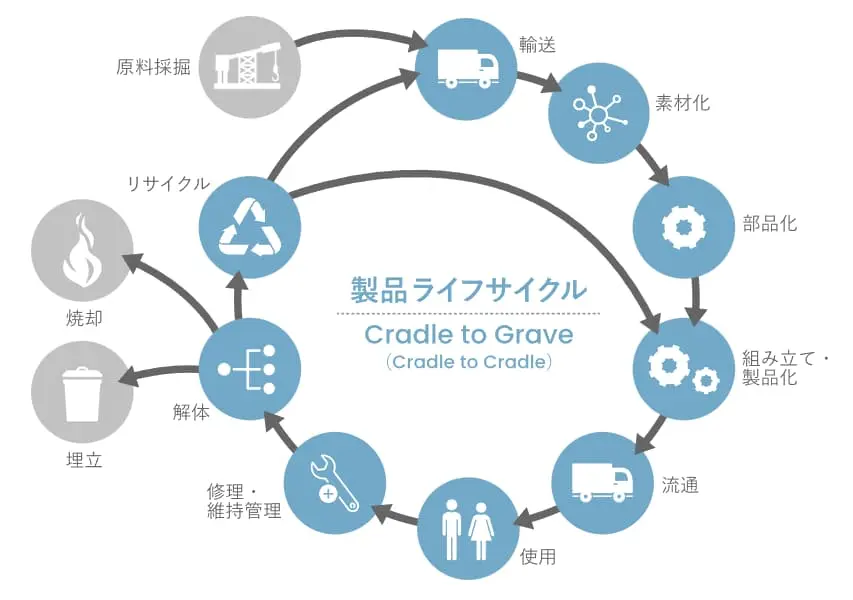 LCA)は、製品・サービスごとに「ゆりかごから墓場まで」の環境影響を算定します。