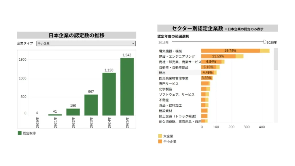 2025年9月15日時点の情報で認定を取得した企業は1,543社と、取得する企業が本格的に増え始めた2021年から1,500社増えています。