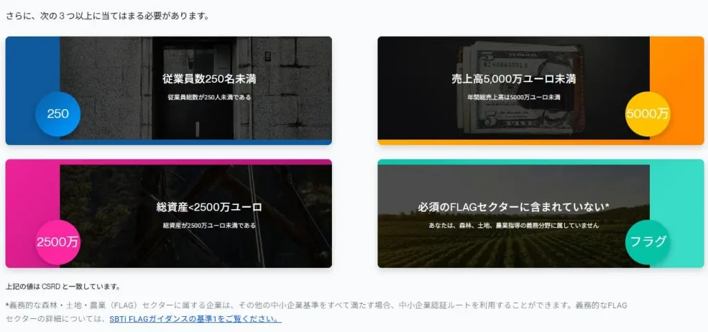 これらはSBTiが定義する「中小企業の判定基準」であり、ヨーロッパCSRD(企業サステナビリティ報告指令)と整合しています。