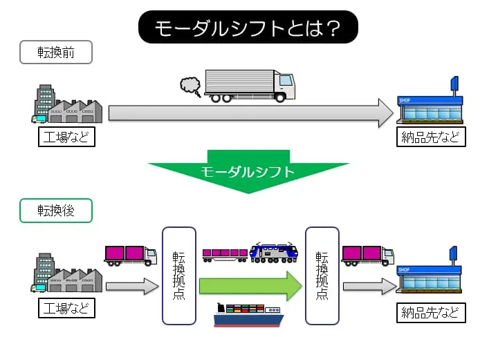 鉄道はCO₂排出が少なく、海運は大量輸送に強いため、幹線物流の低炭素化に有効です。